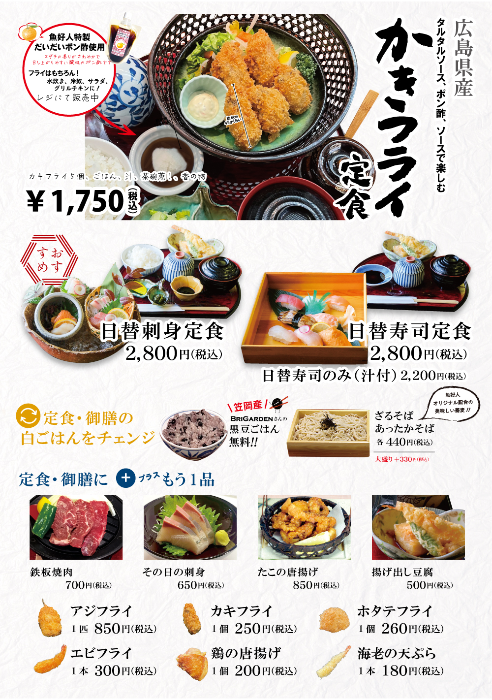 笠岡市でランチ昼定食を食べるなら、メニューも豊富な魚好人一休笠岡店へ。 新鮮食材で男性も女性もお子様も満足していただけることと思います。